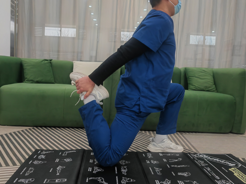 (1)身体呈单腿跪姿,右腿屈膝向前,左腿屈膝跪地,同时双手向后抓住左脚;保持身体稳定,双手将左脚拉向臀部,直至左腿股四头肌有中等程度的拉伸感。保持20~30秒后,换另一侧进行该动作。