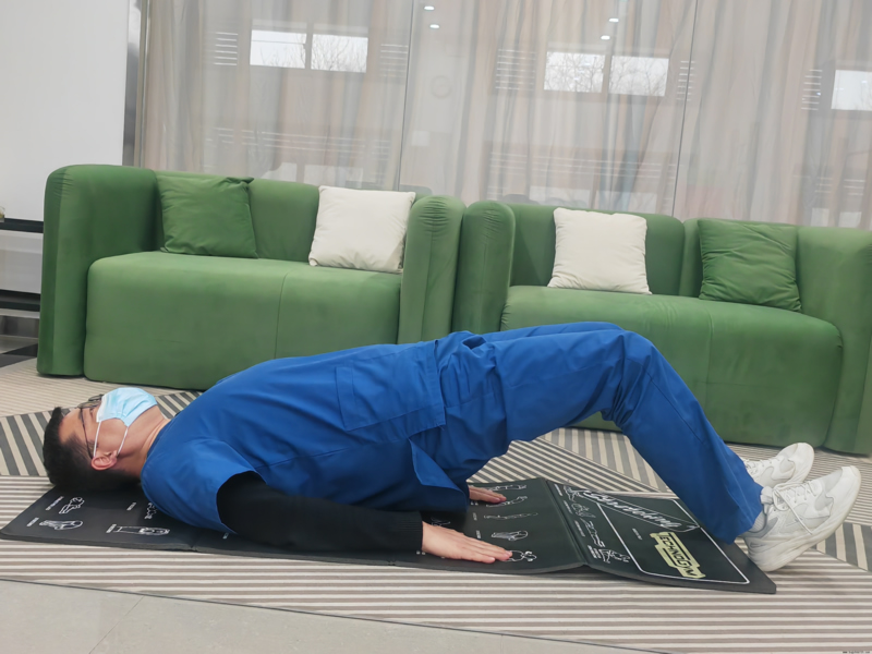 1. 仰卧位腹式呼吸训练。身体放松,俯卧在垫子上,双脚并拢,双手叠放在额下,用鼻腔缓缓吸气,大约用时4秒,胸廓尽量保持不动,腹腔向两侧和背侧扩张顶起;然后屏气2秒。用嘴缓缓将气体呼出,大约用时6秒,并在呼气的同时收缩腹部,以尽量将气体呼出。重复练习规定次数。10~15次/组,做3组。
