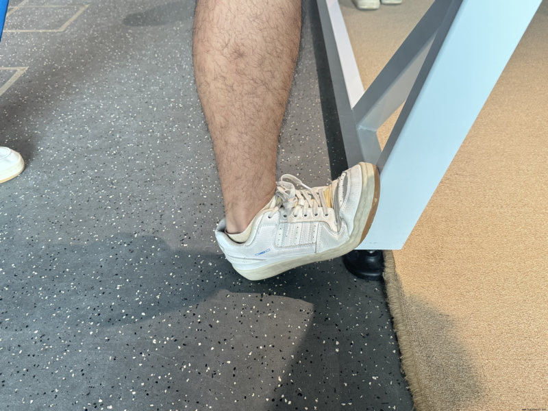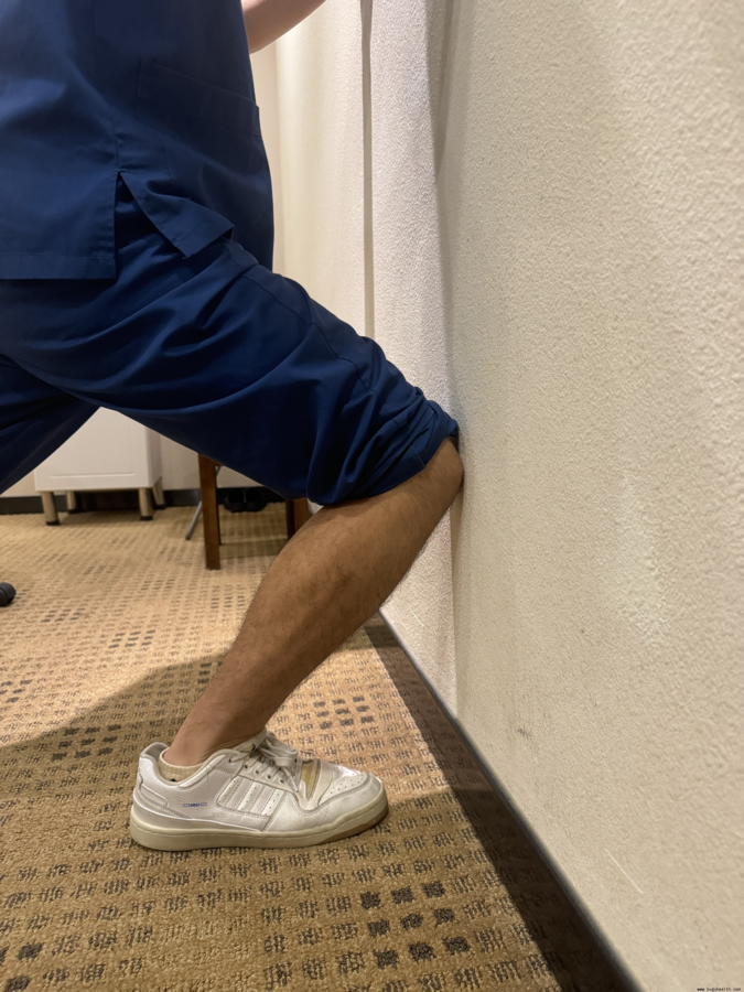 踝关节活动度练习:利用膝关节顶墙,观察脚尖距离墙面的距离,来判断踝关节活动度的好坏。同样可以作为练习动作,在踝关节活动末端反复进行。