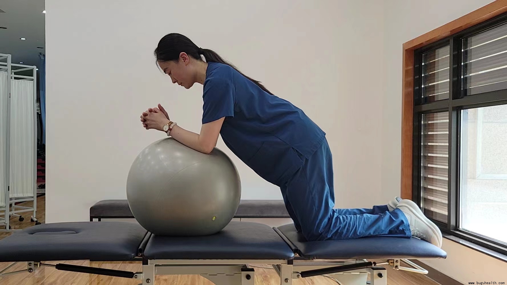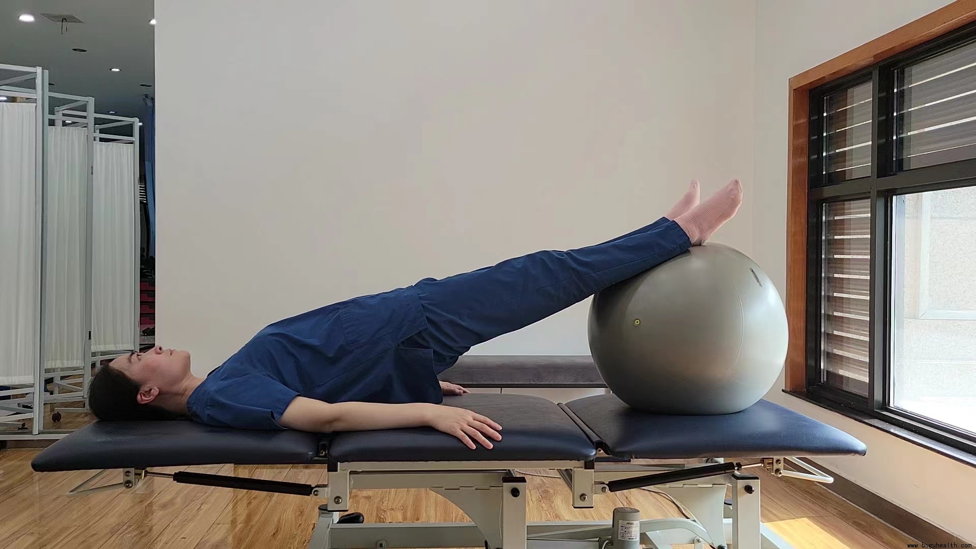 仰卧位双脚搭在瑞士球上,收腹将腰部压实床面;