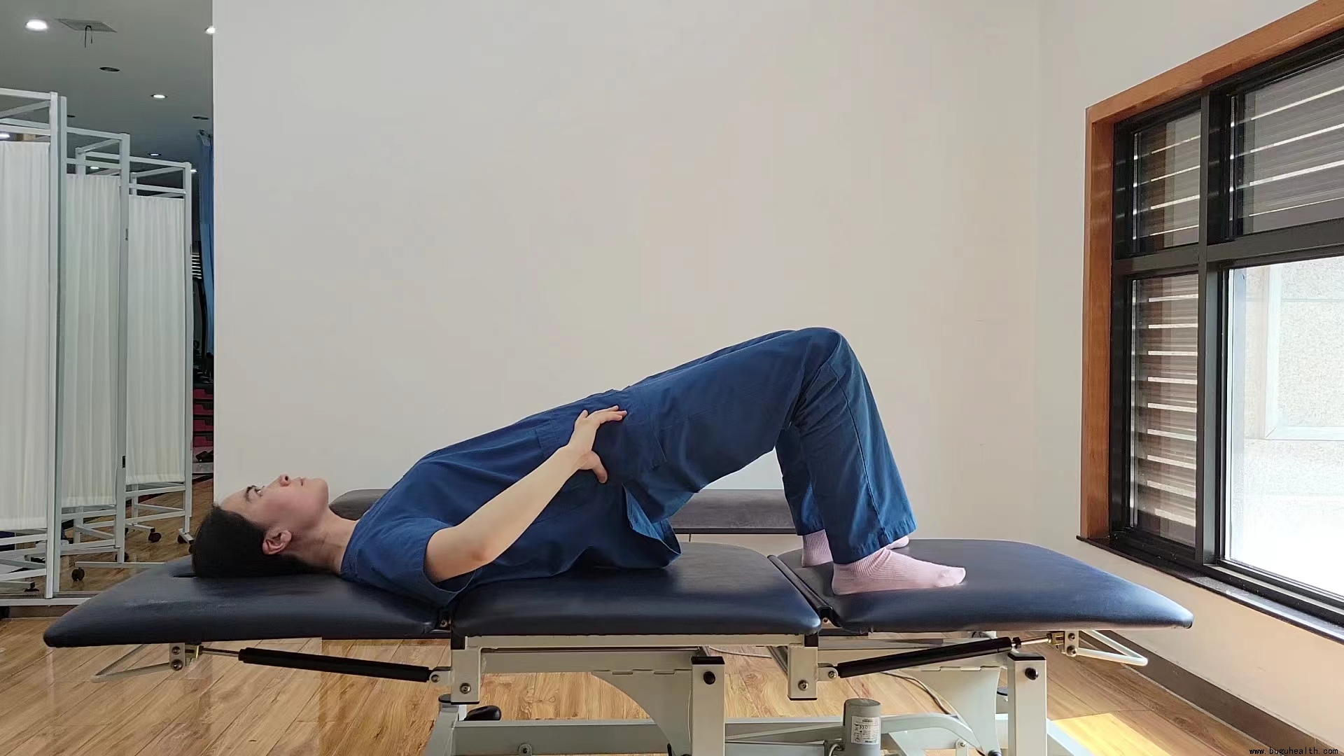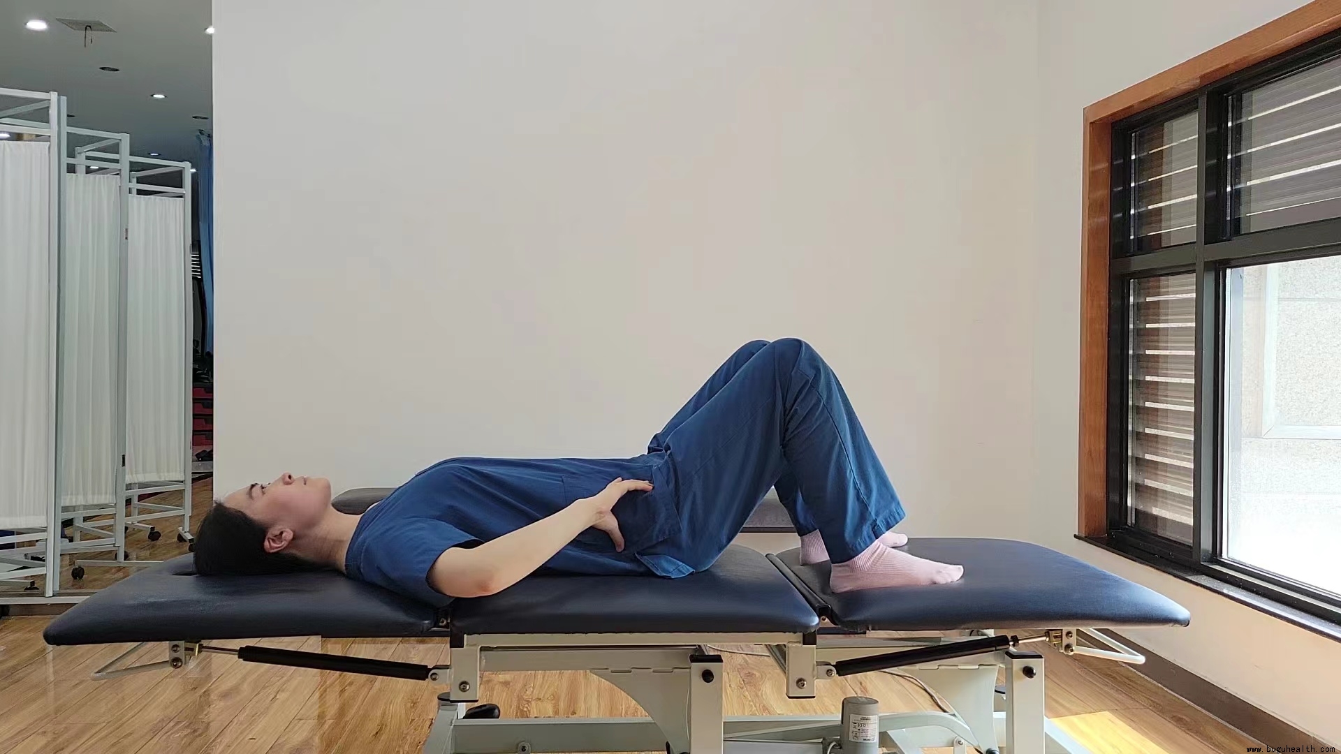 仰卧位双脚踩在床上,收腹将腰部压实床面;