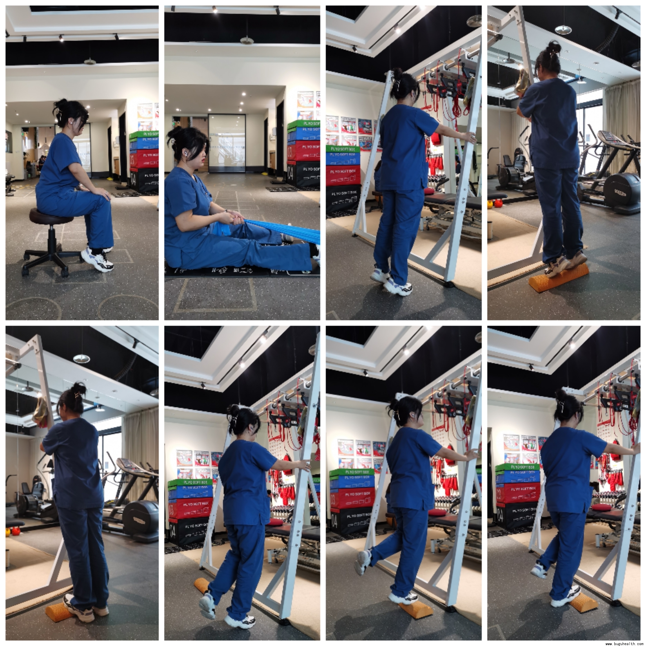 屈膝弹力带90度抗阻背屈跖屈——膝关节伸直位弹力带抗阻背屈跖屈——坐位双脚提踵——站立位双脚提踵——斜坡上双脚提踵——地面单脚提踵——斜坡单脚提踵