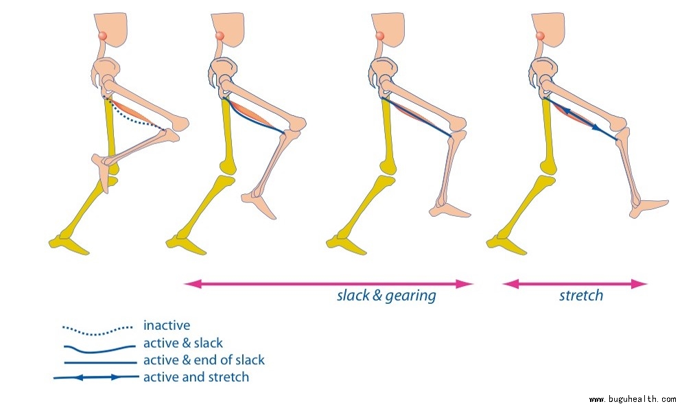 行走和跑步时,下肢摆动期的后半段,腘绳肌被拉伸到了最长的状态,肌肉内部张力逐渐达到了最大。此时,为了阻止进一步的髋关节屈曲和膝关节伸展,腘绳肌会进行离心收缩。此时,腘绳肌的收缩活动达到顶峰,腘绳肌强烈收缩而股四头肌处于放松状态。有学者认为,这些肌肉之间的协调性不佳,会导致腘绳肌拉伤。股二头肌的拉伸幅度最大,这可能是在高速跑步过程中,股二头肌比其它两块肌肉(半膜肌和半腱肌)更容易受伤的原因。